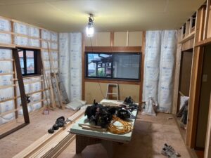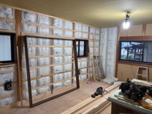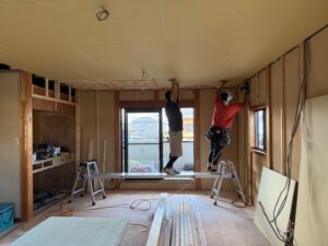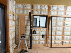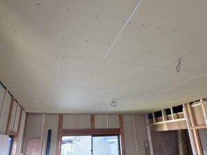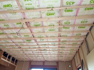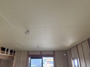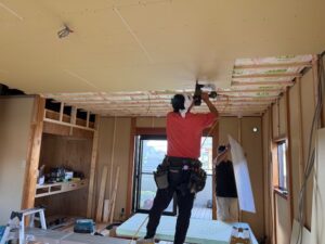 本日の作業内容は天井ボード張り、壁下地、壁断熱、窓枠取付を行いました。明日も引き続きよろしくお願いいたします。またアップします。
