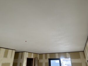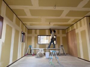 本日の作業内容はパテのケレン作業を行った後に天井のクロス施工しました。明日は壁のクロス、電気工事、建具工事を行います。引き続きよろしくお願いいたします。またアップします。