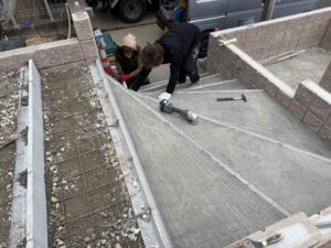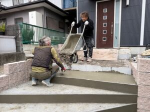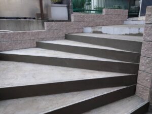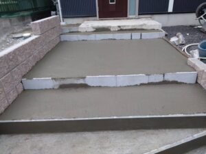 今日の作業内容は階段部分の工事になります。生コン打設も行いました。まだ仕上げではないですが立ち上がりは押さえで歩行部は刷毛引きで仕上げる予定です。引き続きよろしくお願いいたします。またアップします。