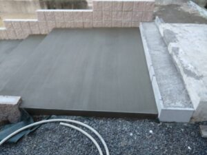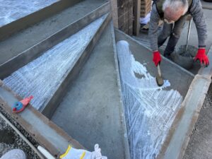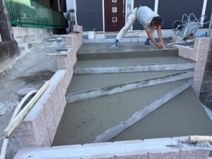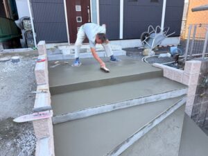 今日は階段の天端を仕上げました。歩行面になりますので滑りにくい様に刷毛引きで仕上げております。明日から週末まで乾燥養生で来週はポストなどの設置を行う予定です。引き続きよろしくお願いいたします。またアップします。
