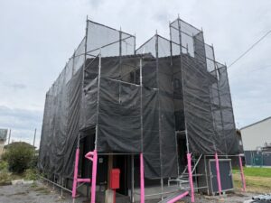 本日の作業内容は足場架設です。隣地の境界に注意しながらしっかり敷地内に足場納めて架設完了です。明後日からコーキング工事に入っていきます。引き続きよろしくお願いいたします。またアップします。