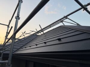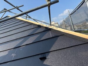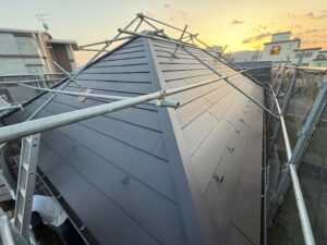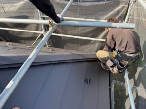 本日の作業内容は棟板金の施工を行いました。急勾配で大変な作業でしたが無事に完了です。月曜日から塗装班が養生作業からスタートします。引き続きよろしくお願いいたします。またアップします。