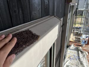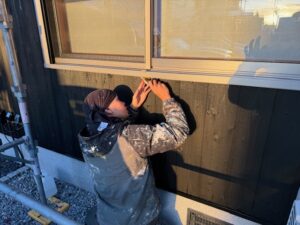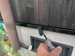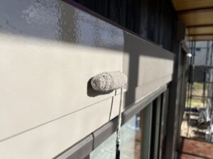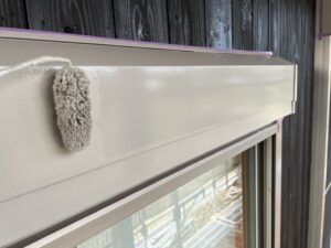 本日の作業内容は付帯部の塗装です。シャッターボックスも塗装しました。キシラデコールで塗装しているので塗料の性質上、養生の隙間からサッシに塗料が付着しやすいのでその掃除も進めていきました。来週はウッドデッキ塗装進めていきます。引き続きよろしくお願いいたします。またアップします。