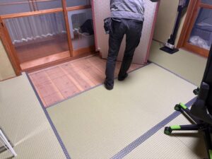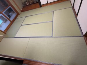 本日の作業内容は畳の入れ替え工事です。和紙畳で制作させて頂きました。凹凸の多い間で難しい入れ替えでしたが手直しなどを経て無事に完了しました。ヘリの柄も素敵な模様でカッコよかったです。引き続きよろしくお願いいたします。またアップします。