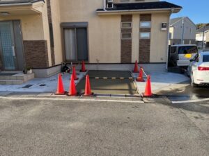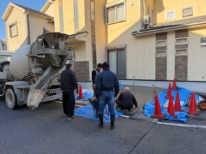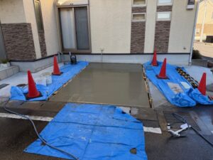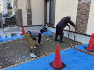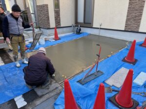 本日の作業内容は土間打設工事を行いました。2回目の土間打設です。これで土間部分は完成です。来週乾いたら目地など施工していきます。引き続きよろしくお願いいたします。またアップします。
