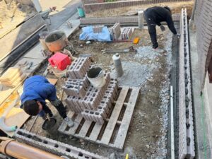 今日はブロック積み作業でした。高かった配管も調整完了です。次はマスの高さ調整やRCを敷いて転圧作業です。土間打設工事の前準備を明日も進めていきます。引き続きよろしくお願いいたします。またアップします。