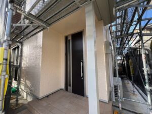 本日の作業は付帯部の2回目の塗装です。23-255で統一してます。外壁の濃いグレー色ともマッチし素敵な仕上がりです。明日は残りの付帯部とタッチアップ進めていきます。引き続きよろしくお願いいたします。またアップします。