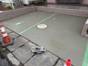 先週の週間予報をみていると雨マークが多くいつ土間打設日にしようか悩みましたが天気も1日良く土間工事進めることができました。土間が乾いたら砕石を仕上げに敷いて完了となります。引き続きよろしくお願いいたします。またアップします。