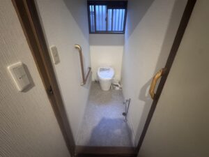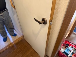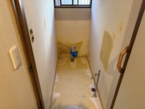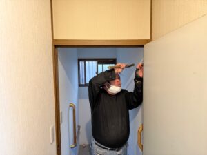 本日の作業内容は朝からクロスとクッションフロア施工しドアノブ交換とドアの調整を行い夕方にトイレ設置しました。手洗いは後日設置します。明日はユニットバス施工です。引き続きよろしくお願いいたします。またアップします。