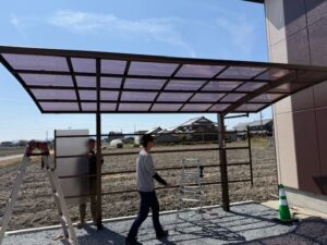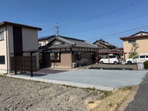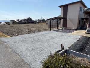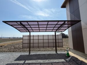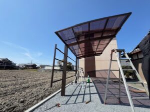 Mさま邸、外構工事完了しました。ビニールハウスの解体から始まり、地盤を固めてカーポート設置しました。今回は土間打設してないので風あたりが強そうな設置場所なのでカーポートの柱1本あたりに約600kgほどのコンクリートを足元に打設しました。Mさま大変お世話になりありがとうございます。今後ともお家のお困りごとはアイホームまでよろしくお願い致します。
