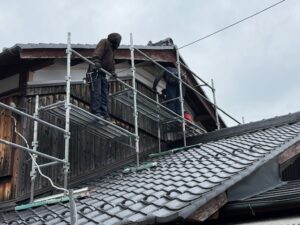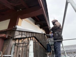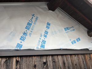 本日の作業内容は板金工事の下地です。プリント板を貼る上下に見切り板金を設置し下地に胴縁を打ち付け透湿防水シートを施工しました。明日から板金施工入っていきます。引き続きよろしくお願いいたします。またアップします。
