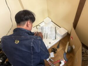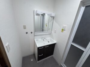 本日の作業内容は追加でいただきました洗濯機の移設工事をさせて頂きました。別の部屋に置けるよう給排水工事を行い洗濯パンを設置して洗濯機を設置しました。洗濯機を移動させたことで空いたスペースに幅750の洗面台を設置させて頂きました。これでAさま邸の水廻りのリフォーム工事は完工となります。大変お世話になり本当にありがとうございました。お家のお困りごとはアイホームまでよろしくお願い致します。