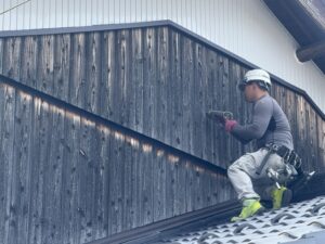 本日の作業内容は足場解体作業です。1面足場だったために転倒防止の為に壁つなぎを取らせて頂きましたのでその穴もしっかりコーキングで処理しております。Sさま邸の板金工事、これで完工となります。大変お世話になり本当にありがとうございました。今後ともお家のお困りごとはアイホームまでよろしくお願い致します。